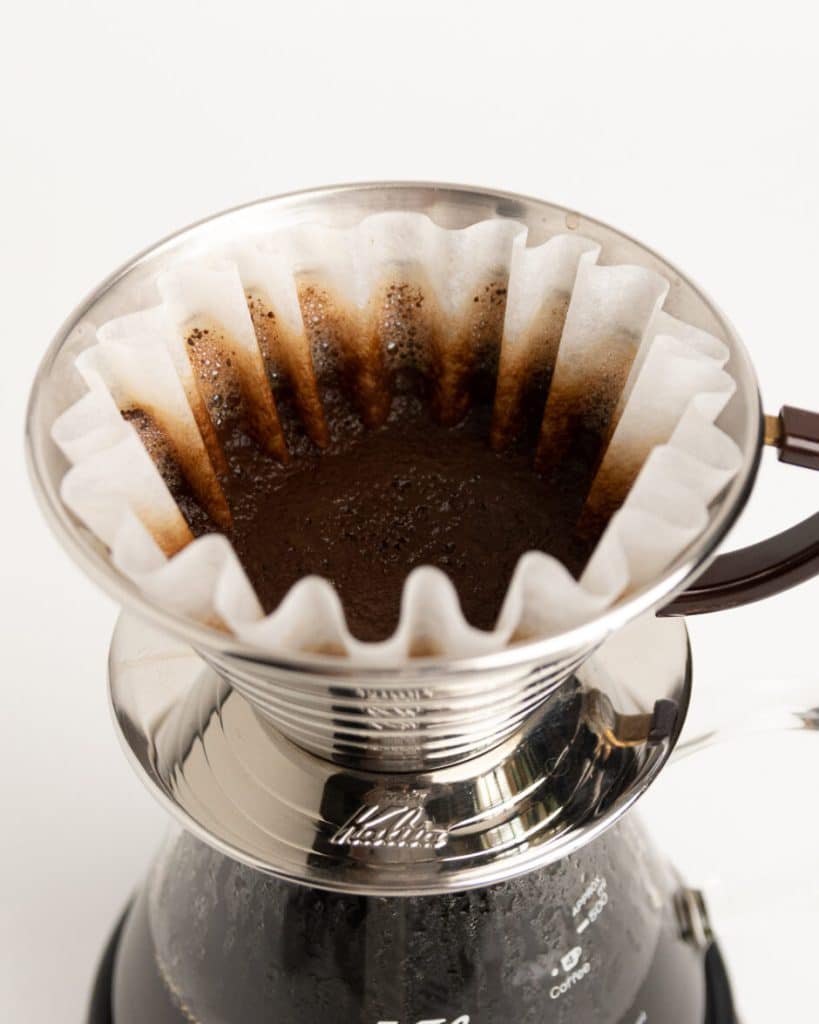STEP 7 • Allow the coffee to continue to drip until you have a slow drip (this should happen at 3-3:15 minutes). You should have a nice flat bed of coffee in your filter.