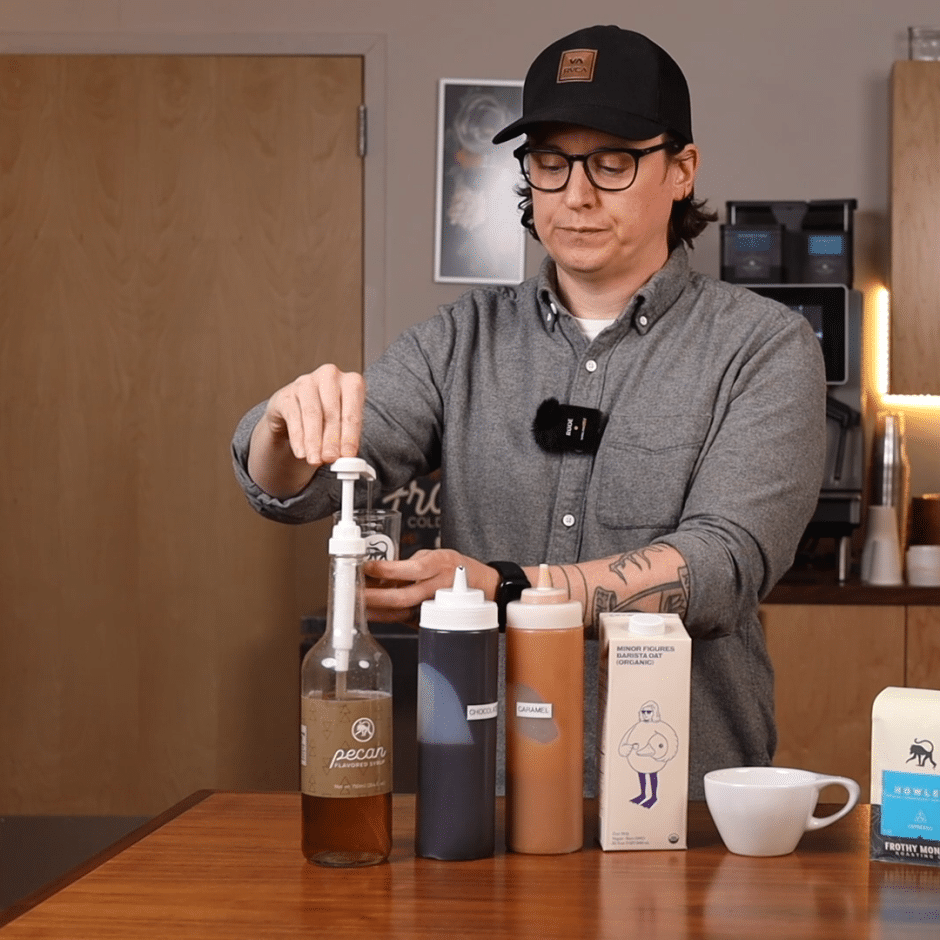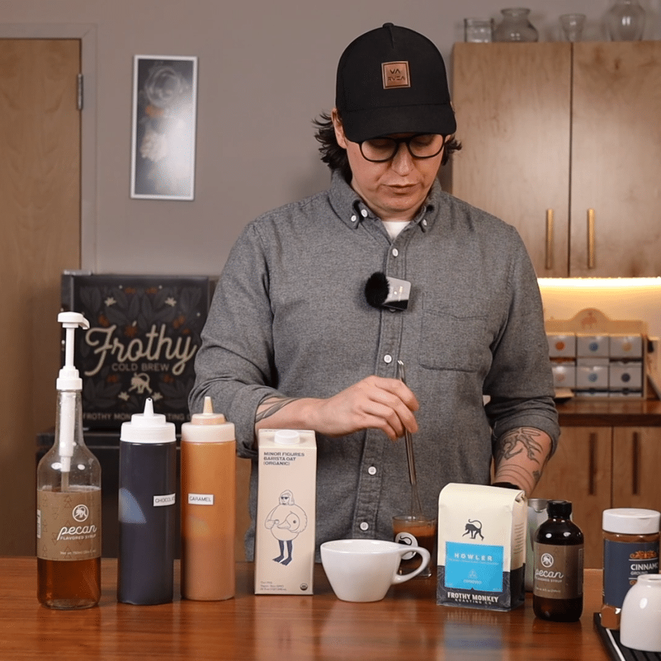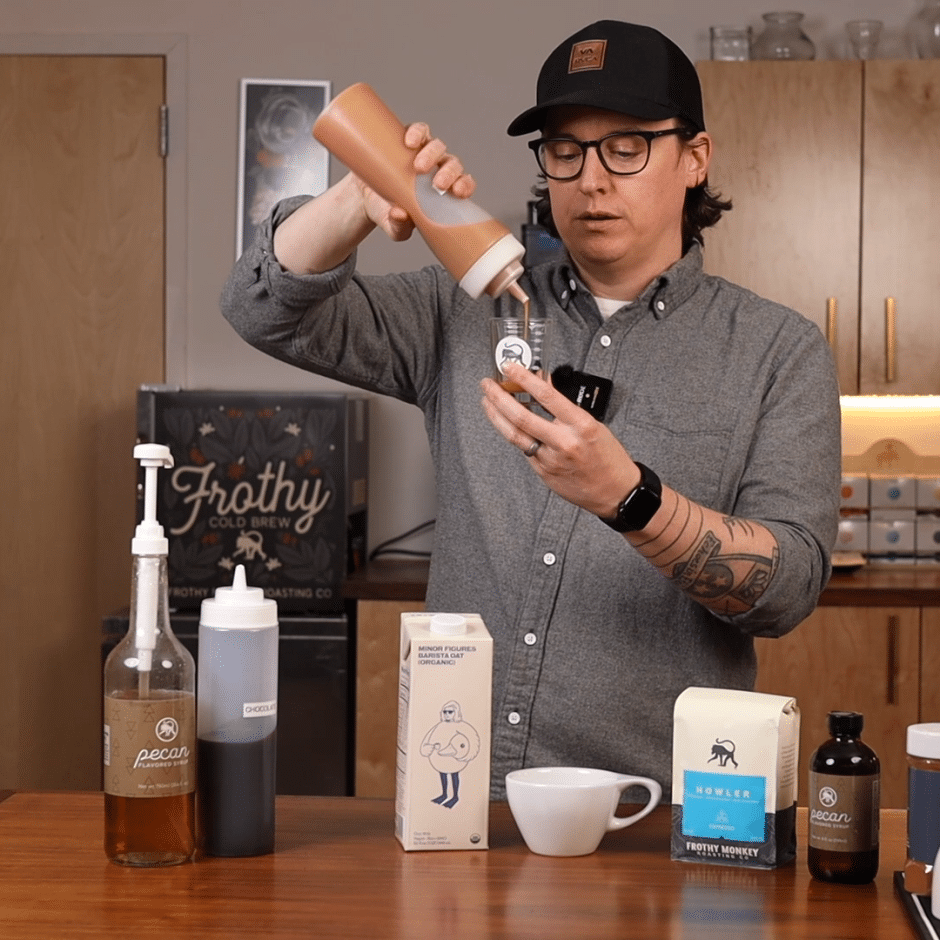 Join our coffee education connoisseur, Ryan Bledsoe as he shows us how to make a Frothy Monkey signature coffee drink, the Turtle Latte. We combine our Frothy Monkey Pecan Syrup, house-made chocolate sauce, house-made caramel sauce, and Howler espresso blend coffee to create a drink we’ve been making for 20 years. This is a must-try Frothy Monkey latte.