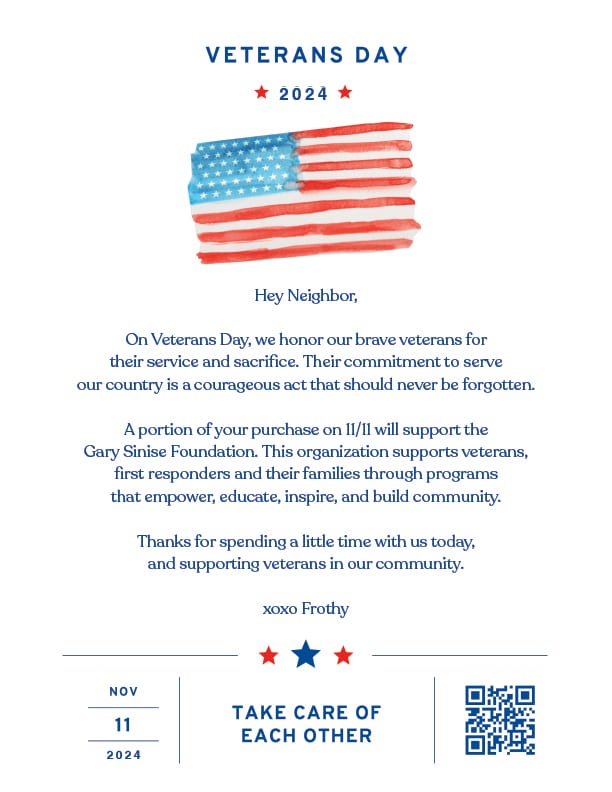10% of your dine in or take out purchases on November 11th, 2024 will support the Gary Sinise Foundation. This organization supports veterans, first responders and their families through programs that empower, educate, inspire, and build community.