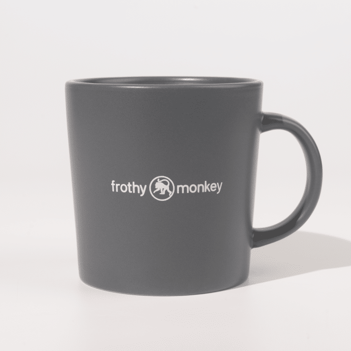 Our 10 oz. Frothy Monkey mug is made with matte grey glazed stoneware ceramic, and it features a traditional Frothy Monkey word mark logo. A comfortable, curved handle makes this perfect for holding your morning, afternoon, or evening coffees.