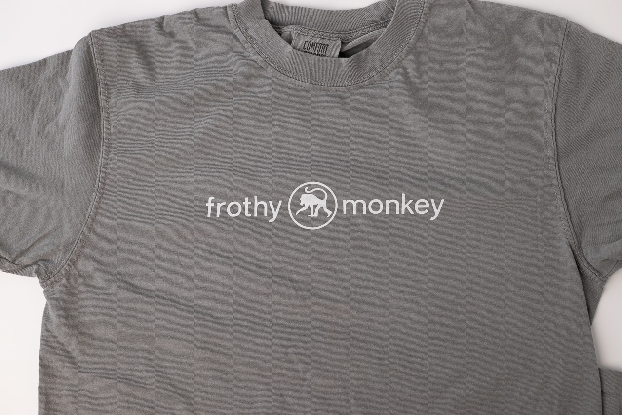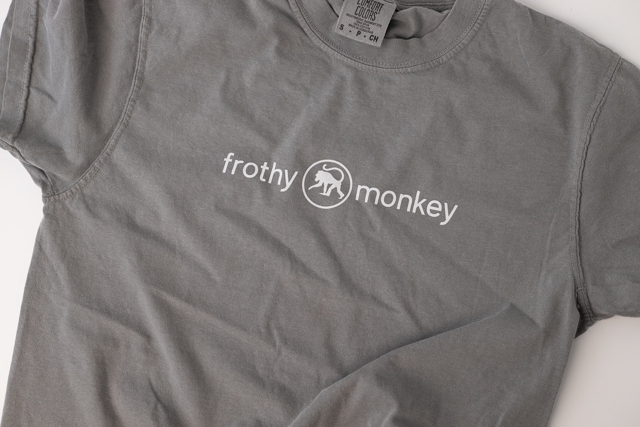 These t-shirts feature our classic Frothy Monkey word-mark logo printed with water-based, soft-touch ink on sustainably sourced 100% ring-spun cotton t-shirts. We are pleased to introduce you to your new favorite t-shirt!