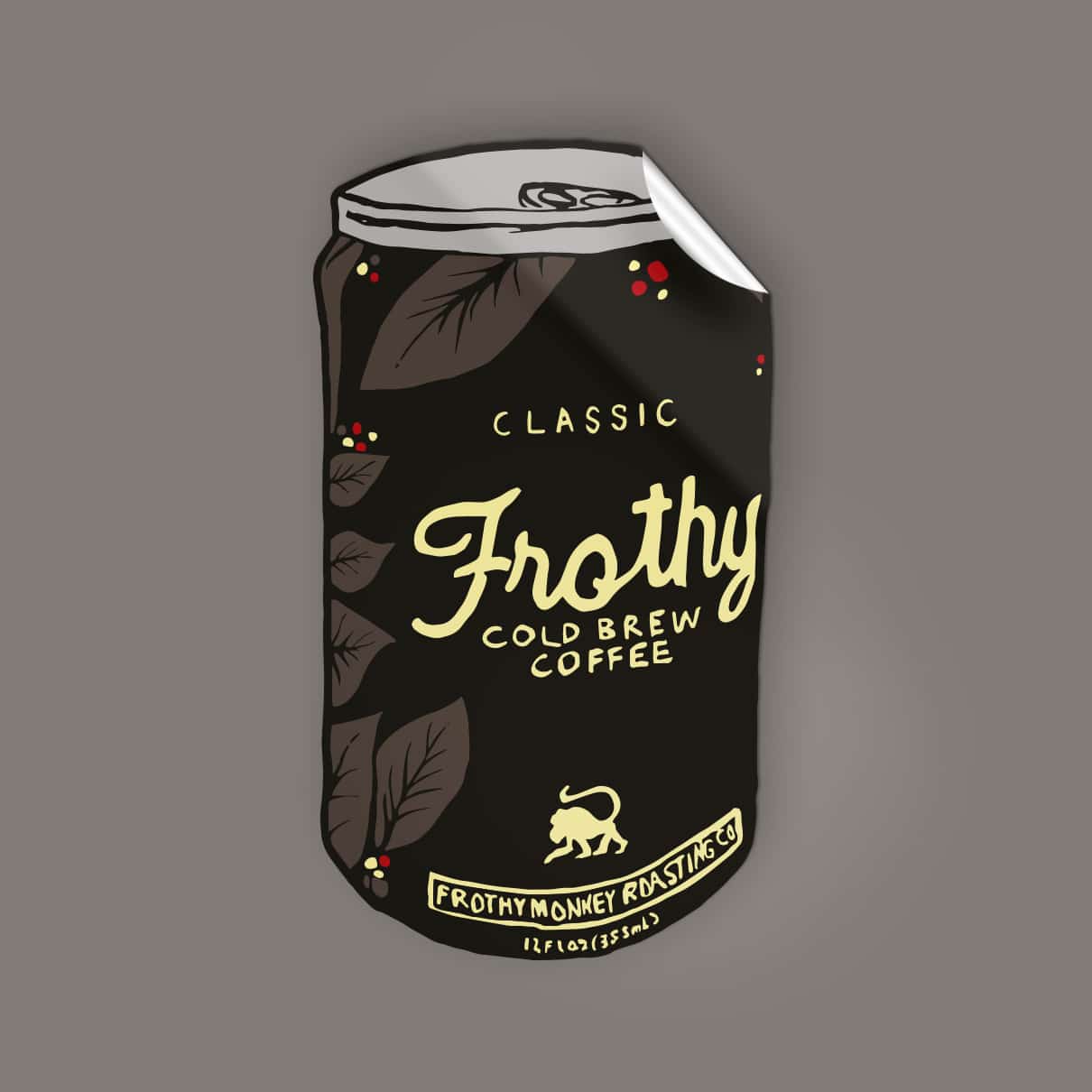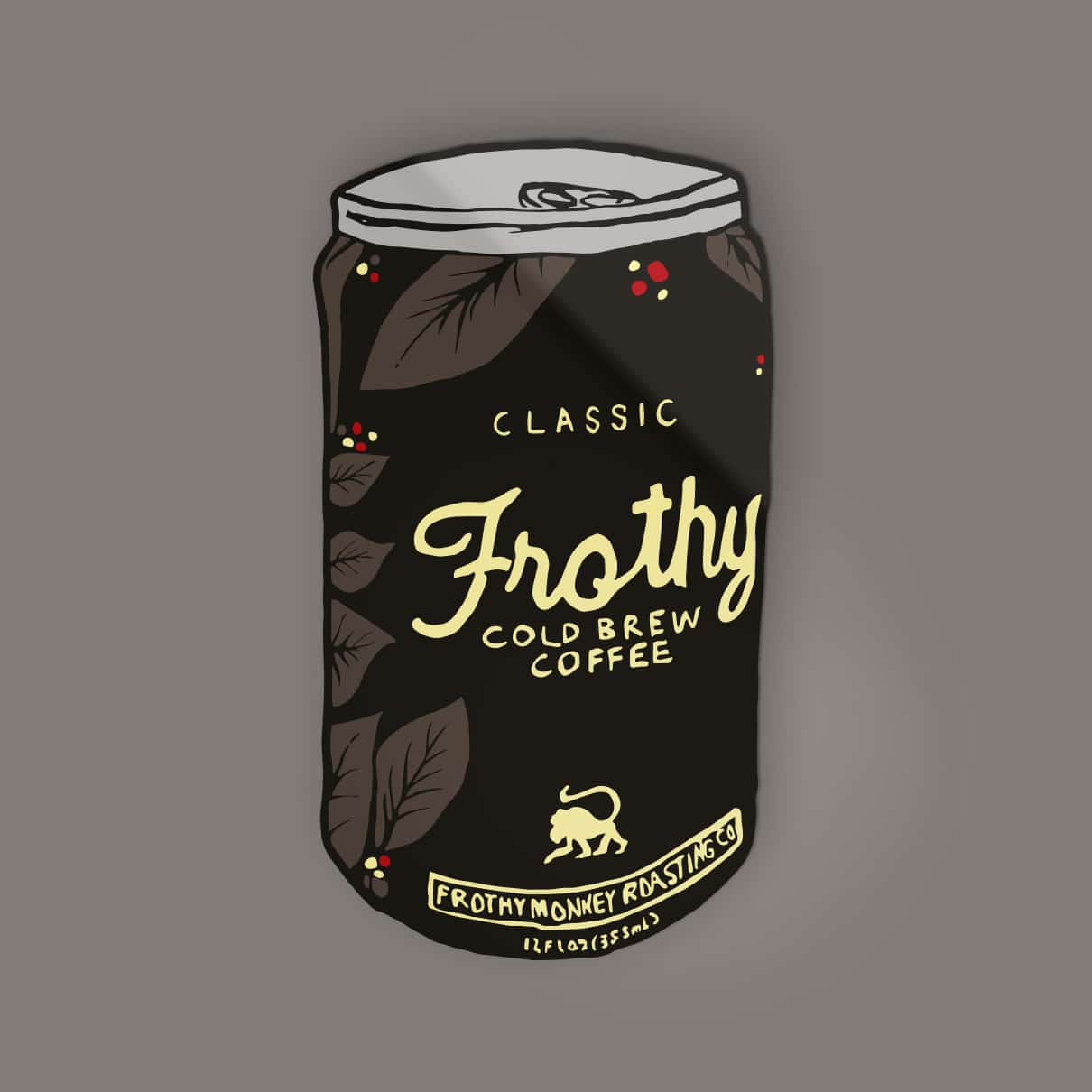 An illustration of our Frothy Cold Brew Coffee can printed on premium vinyl. Our stickers feature a special laminate that protects them from exposure to wind, rain, and sunlight. You can even put them in your dishwasher and have them come out looking brand new.