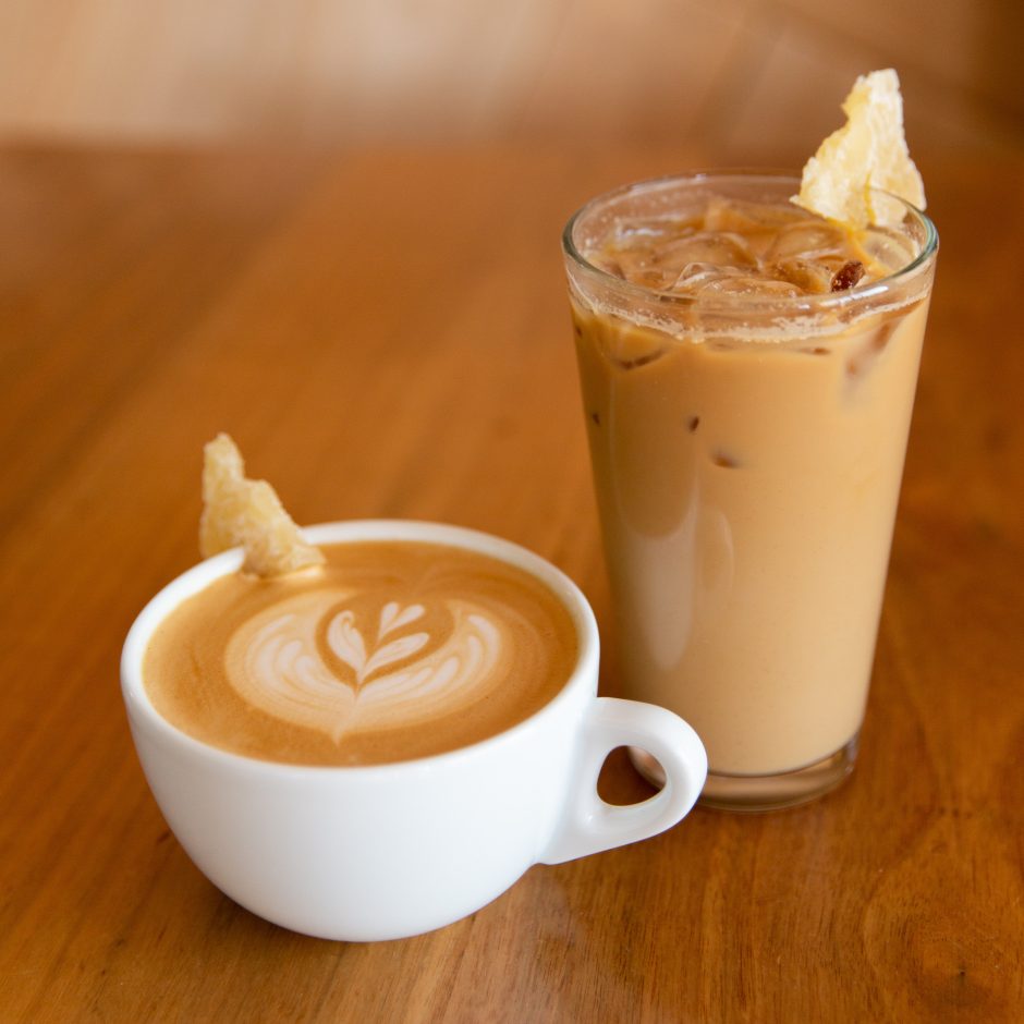 The Hummingbird Latte is a tasty combination of pecan and banana syrup, with espresso, steamed milk and topped with cinnamon and a piece of candied pineapple. (hot or iced)