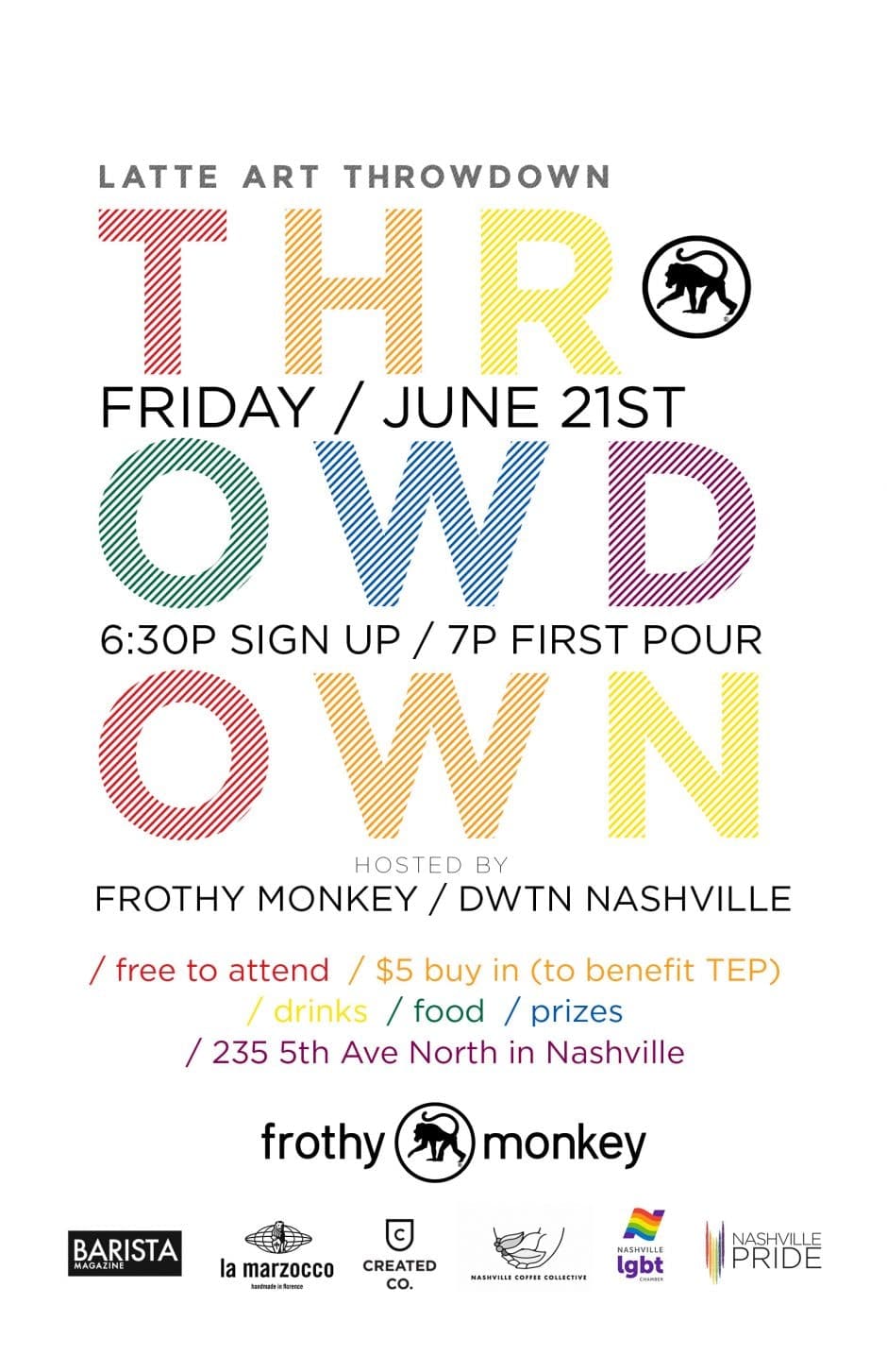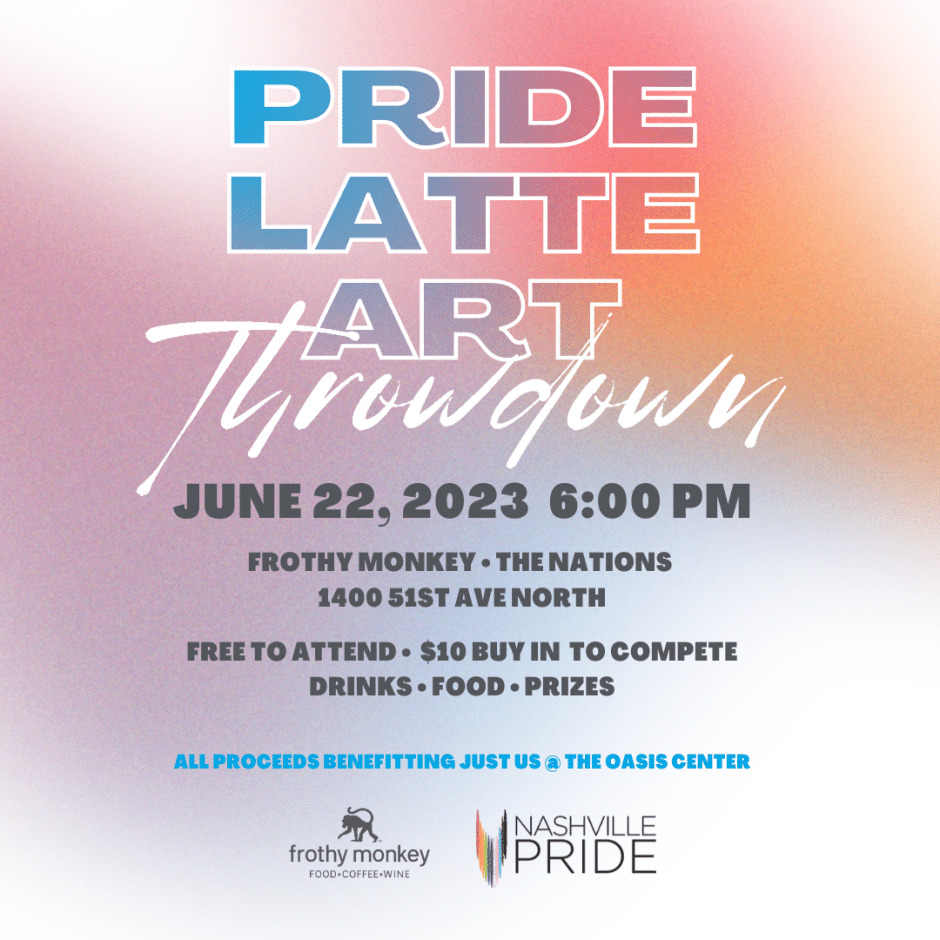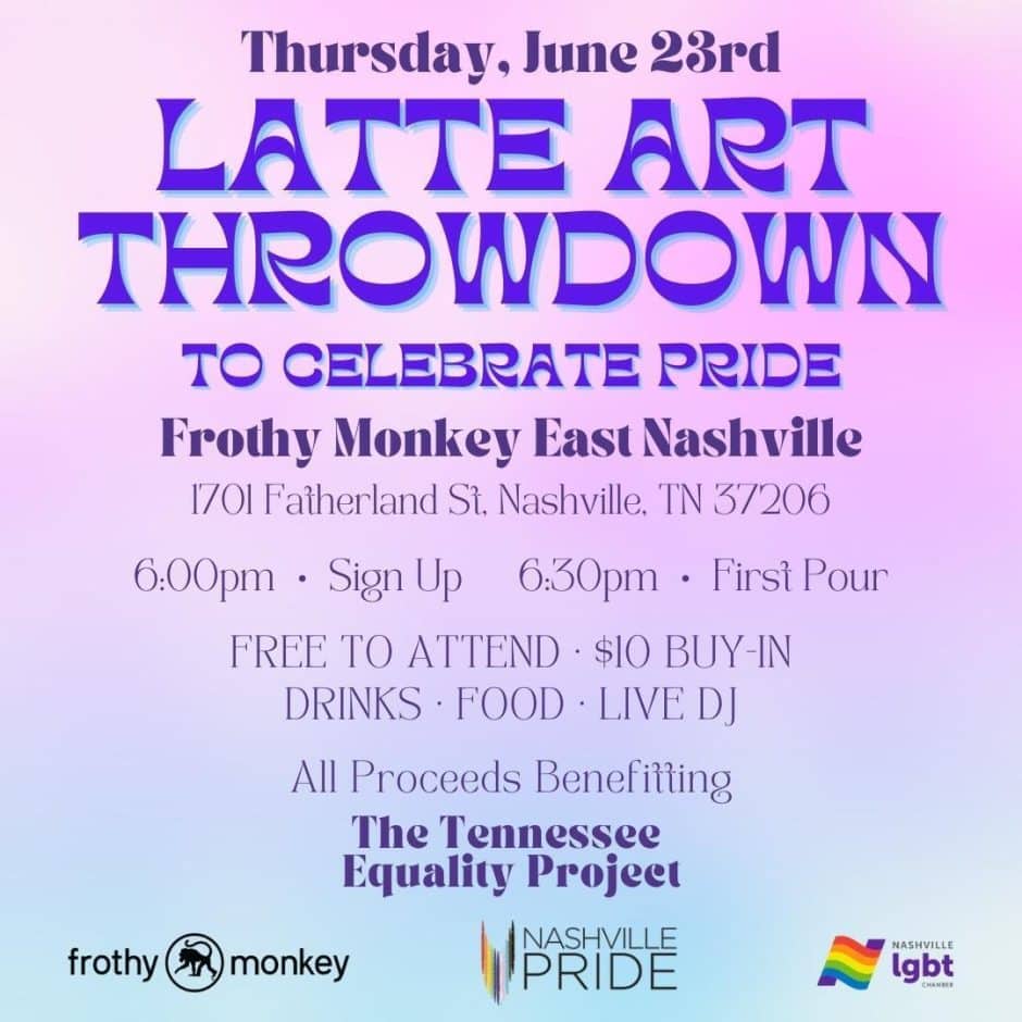 Excluding 2020, Frothy Monkey has hosted the Nashville Pride Latte Art Throwdown since 2018. This recurring competition allows us to connect with other coffee professionals, support a local cause, and share some #FrothyLove in our community. We love creating a welcoming and inclusive environment for any competitor. Just like Frothy Monkey’s cafes, these events are a place where all are welcome.