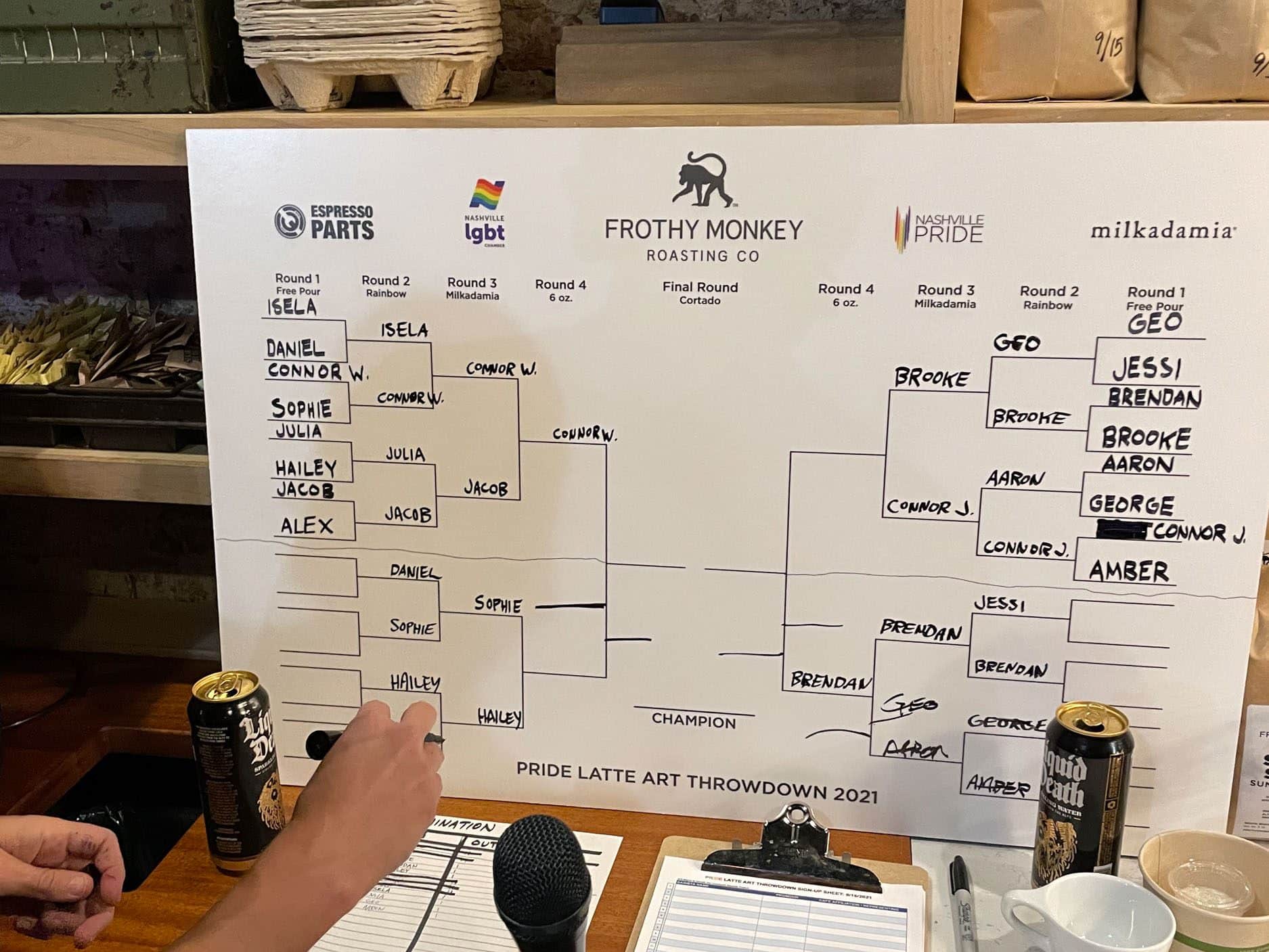 For a latte art throwdown, your MC should be someone who is confident on a microphone, and engaged in the event. They will announce rounds, competitors and themes while guiding the crowd through the event. They are also responsible for keeping track of the competition bracket.